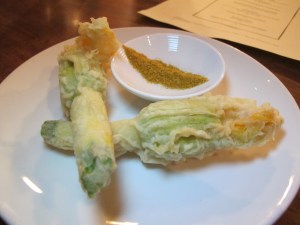 The squash blossoms from the farm are treated as our crown jewels. They are picked first thing in the morning, when they are fully opened, and then placed in boxes with moistened paper towels to keep them fresh. Each one is then gently packed so the blossom is not crushed as it is delivered to our restaurants. Trust me, I have seen the squash blossom protocol around here, and it is a delicate, pain-staking procedure that deserves a chef’s respect. I was happy to report back to Marsha that Nobuo did her proud. The blossoms were stuffed with goat cheese, shrimp and shitake mushrooms and fried in a tempura batter and given a little dish of curry salt on the side to season. They were treated with the same high standards and attention in Nobuo’s kitchen as we give them during harvesting.