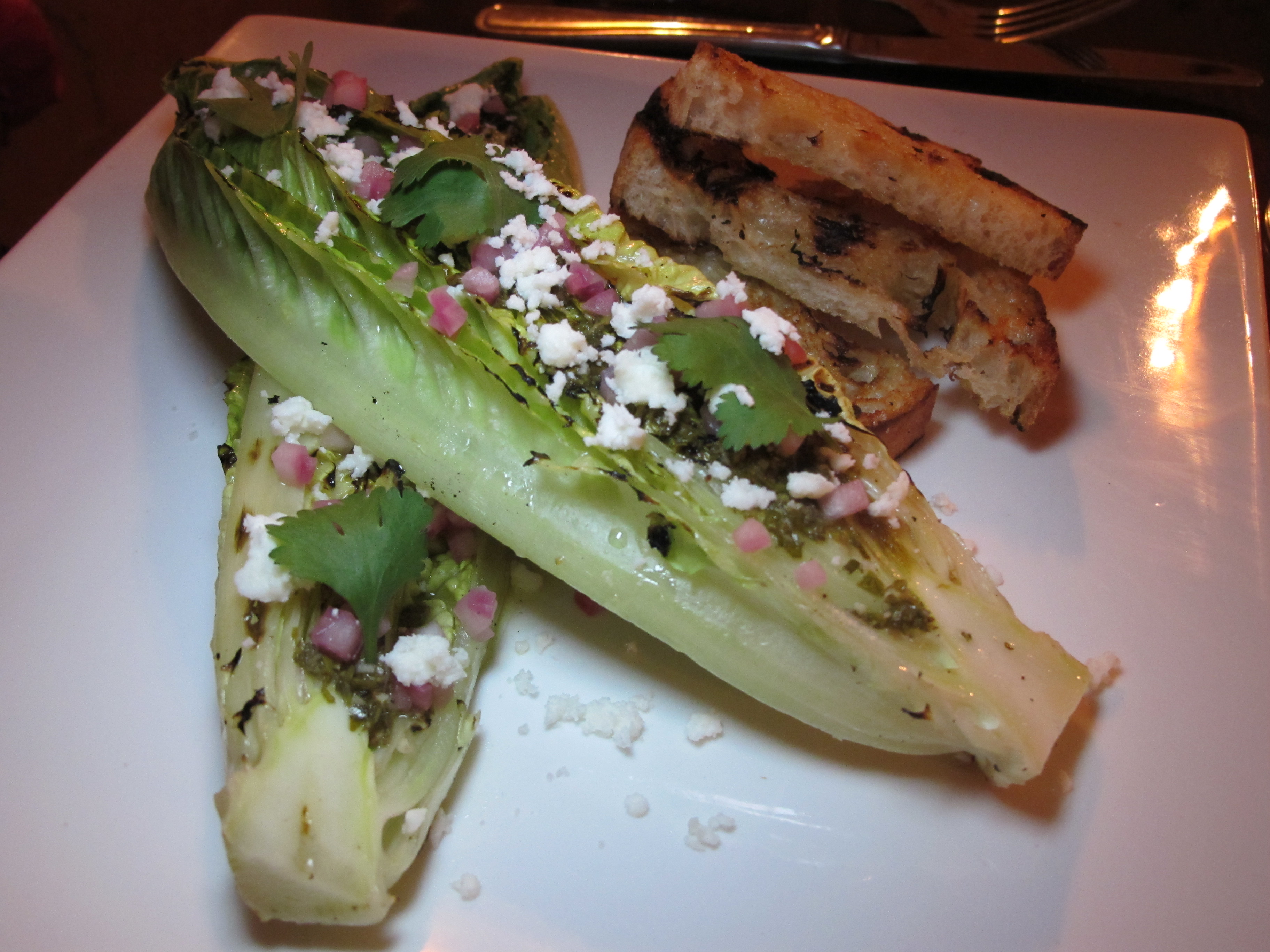 Over five courses Sean and I got to try many of the highlights from the menu. I absolutely fell in love with the Grilled Romaine salad. Such a simple idea, but it was so beautifully done that I know it can’t be as easy as it looks. The Romaine was charred just enough to give it that flavor, and then served with marinated red onions, feta cheese, cilantro and a light lemon vinaigrette.
