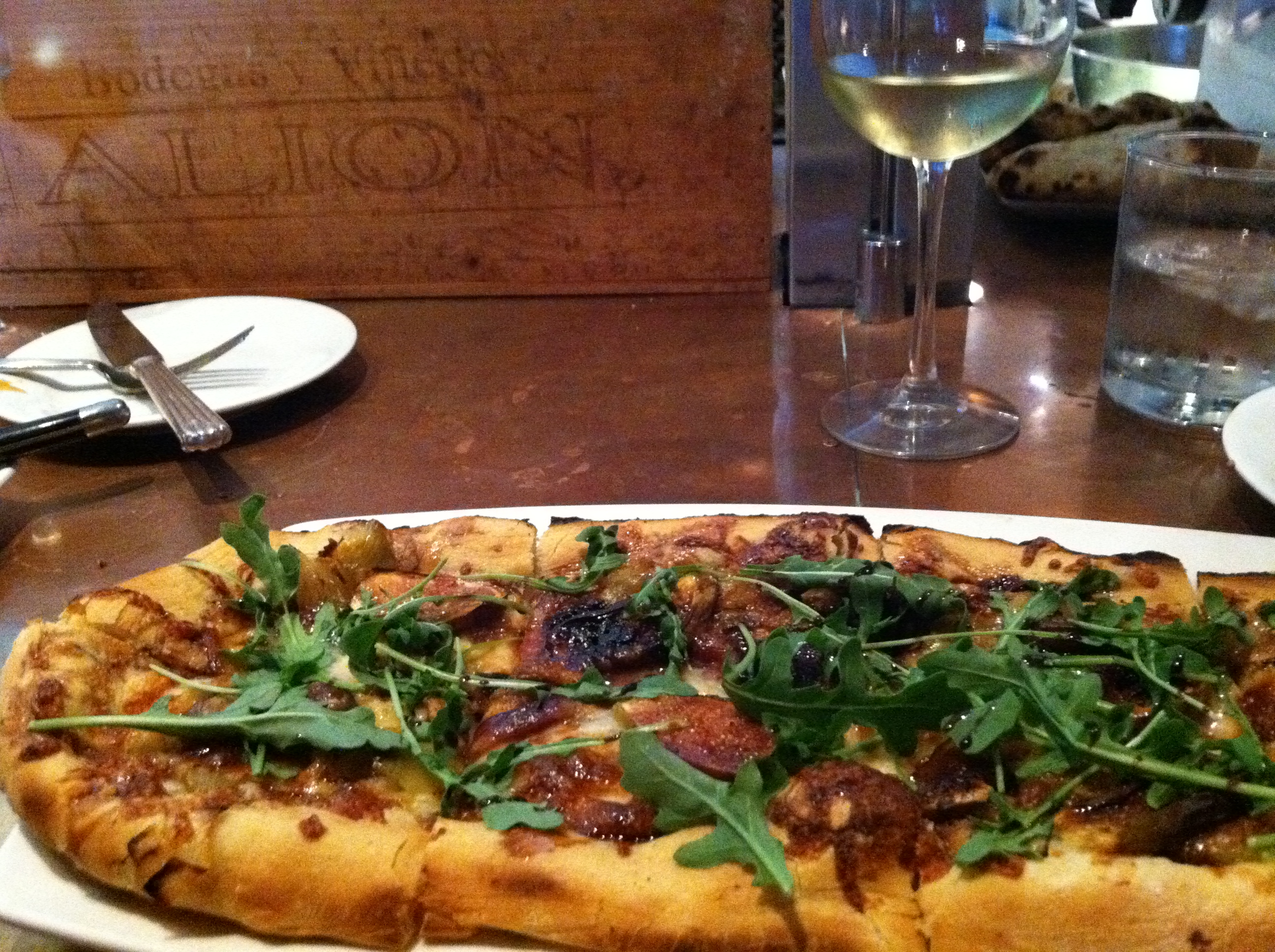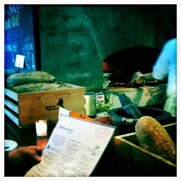 St. Francis seemed like the right place to reward ourselves for a job well done and it was with happy luck that my favorite seats at the kitchen bar were available. It was just what we needed, to sit and relax and watch Aaron Chamberlin and his crew turn out one amazing dish after another. It was a fine dance with each station preparing and plating, a constant movement from the moment orders were being announced as they came in to when the dishes were being inspected as they went out. I have no idea how they do it, but I do love to watch it all going on. Restaurant kitchens always seem like chaos to me, but it is a choreographed science when you put out food like this. We ordered a number of our old favorites from the menu that we have loved, including the roasted chicken and the blue cheese, fig and arugula flatbread, but it was the sides we tried for the first time that blew me away.