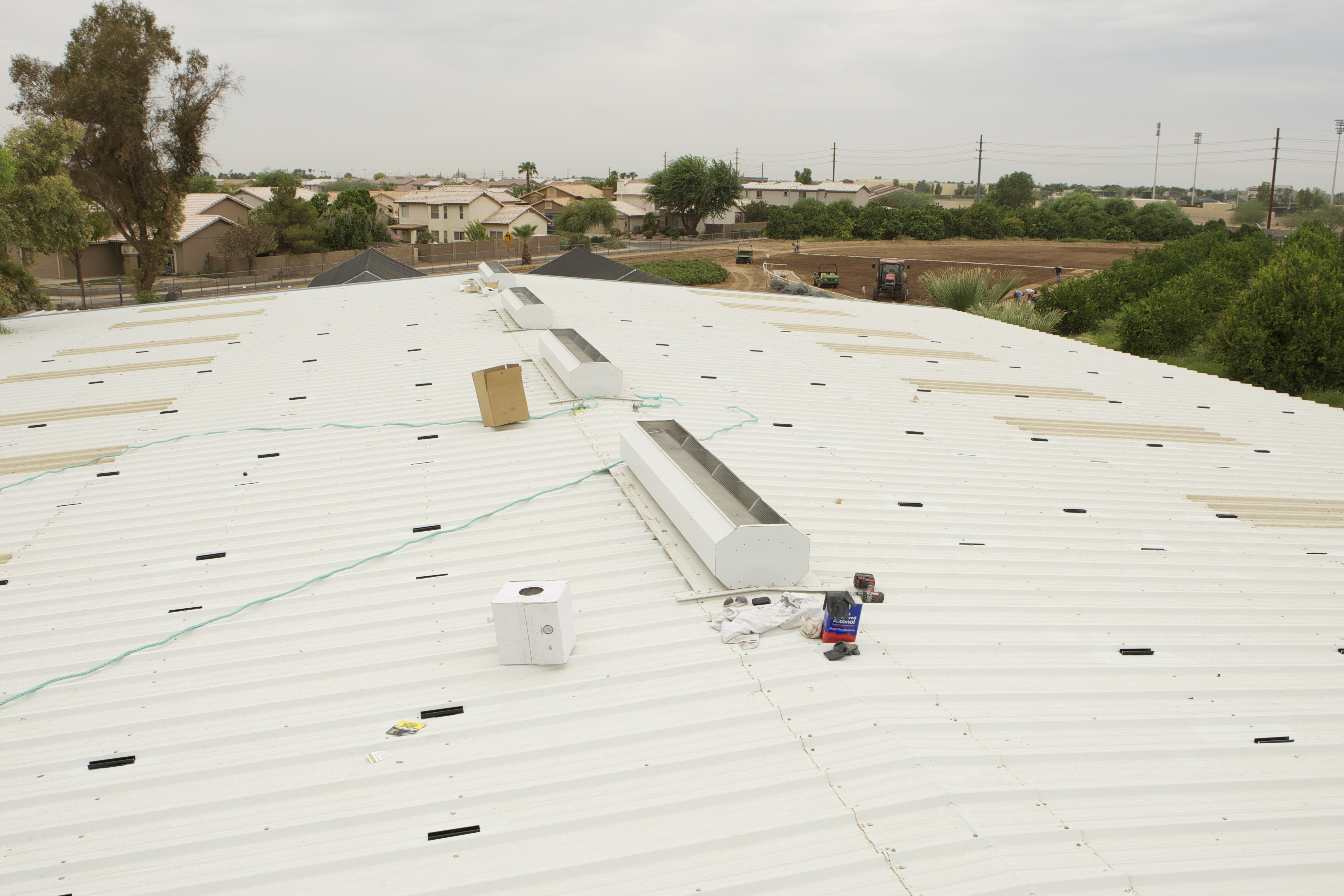 Earlier this summer, we started working with Royal Solar of Arizona on the installation of a 50kW (49.92kW to be exact) solar field on the roof of our warehouse. While Sean was busy prepping the fields for crops, Bob was prepping the roof of our warehouse for the 208 solar panels for our system. Here is a little of the progress as it unfolded this summer…