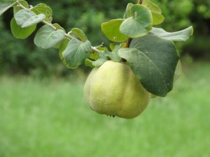 Quince are a funny little fruit that are often too astringent to eat raw, but when cooked they have a wonderful flavor that can be used to make jam or added in pies to enhance the flavor. Marsha cooks them up with some lemon, sugar and cinnamon that is a wonderful side dish on Thanksgiving. To prepare quince, first rinse them off and scrub the fuzz off of them. It isn’t necessary to peel them. If they are too hard to cut through raw, put them in a pot of water and allow them to simmer on low heat covered for 25-30 minutes. This will soften them up. Allow them to cool a bit before cutting, and then you can quarter then and remove the seeds, like you would with an apple.