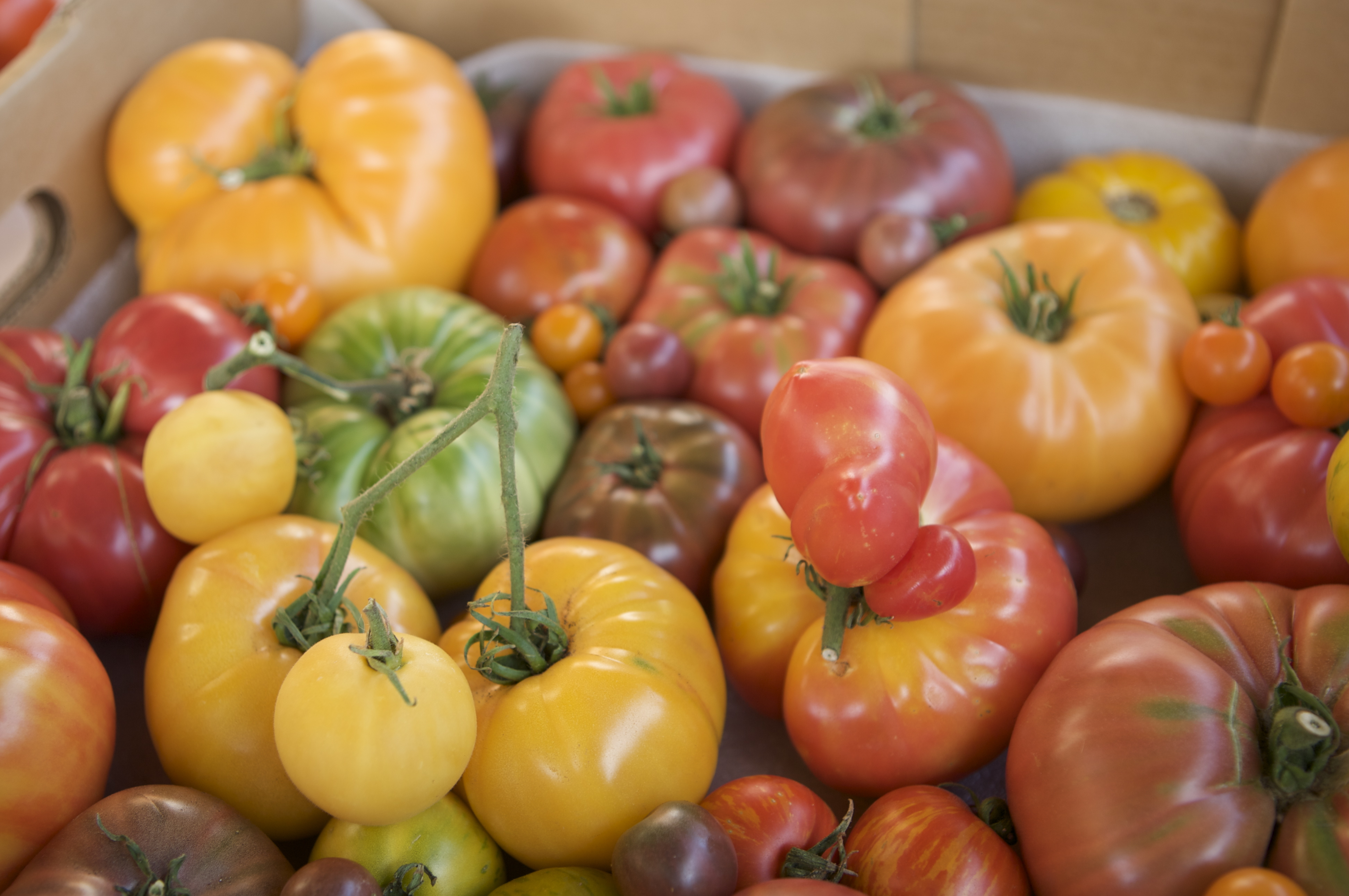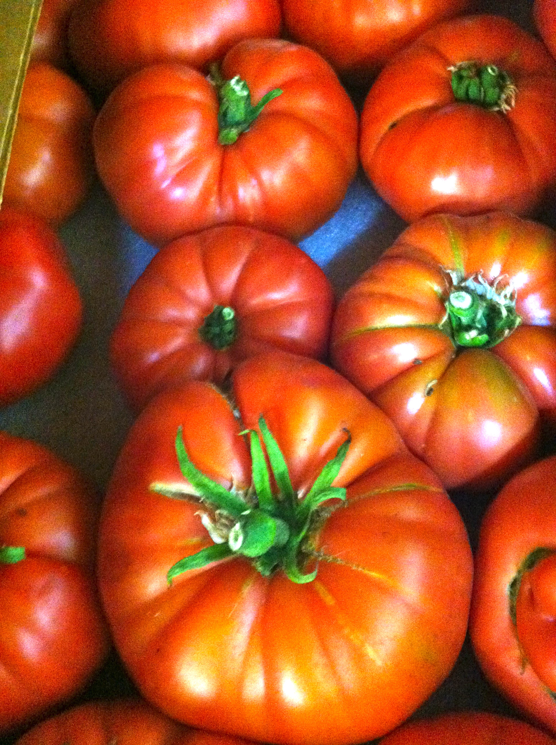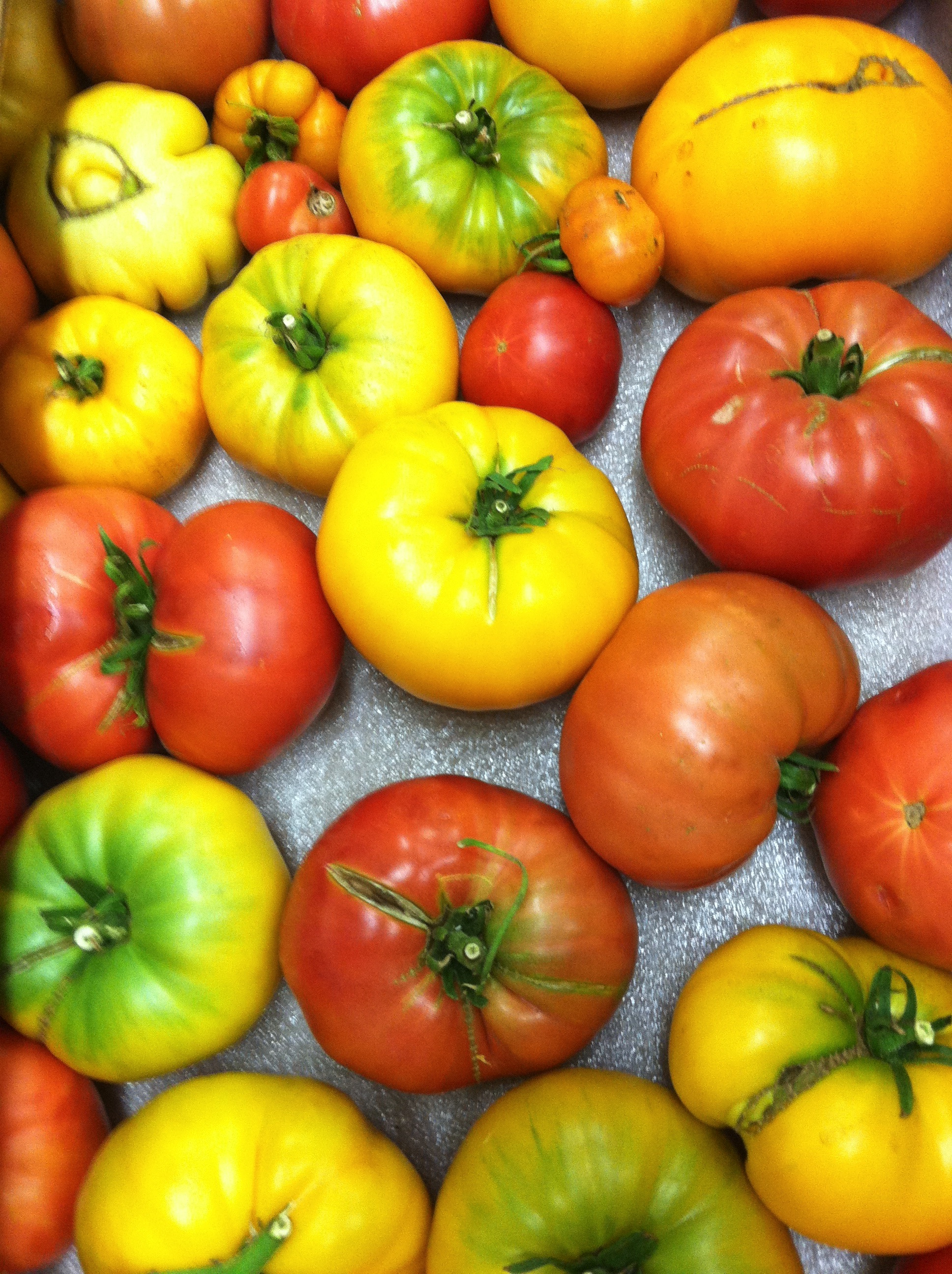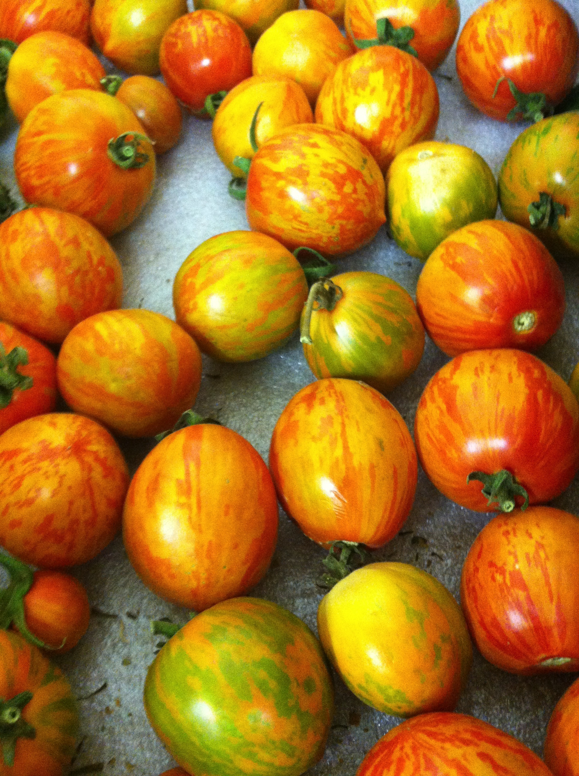 It is that time of year. Actually, it is about 10 days early for that time of year. Our heirloom tomatoes are ripe and in abundance, ten days earlier than normal, and we will have a gorgeous selection at the Town & Country Farmers’ Market this Wednesday. There have been some questions about the heirlooms in the past, so let me take a moment to clear up a few misconceptions. First, heirloom tomatoes can be used for any tomato recipes or dishes you are wanting to make, but they are so full of flavor that you don’t need to dress them up to show them off. They speak for themselves quite nicely. Secondly, yes, they can be a little funny looking. They come in different shapes and sizes, but they are born to look that way. The best ones have big cracks and funny shapes and large shoulders. Trust me, those are the ones that are filled with flavor. Third, they come in all sorts of colors, not just red, so be adventurous. My favorites are the little orange Sun Golds that taste like they were already dipped in olive oil and lightly seasoned. I can eat them by the basket full this time of year. My new favorite is the Arkansas Marvel, you will want to try that one for yourself. Marsha cut one up and brought it into the office for us to try, there was but a slice of it left by the time Bob and Sean came in. Fourth, there are green ones, but this does not mean that they are unripened. We have three different varieties of dark green tomatoes coming to the market this week, and they fully ripened and ready to eat. And finally, they have funny names, names like Arkansas Marvel, Golden Nugget, Early Girl, Granny Cantrell, German Pink, Prudens Purple, Cherokee Purple, Mr. Stripey, and Brandywine. They are so lovely and unique, it would be disappointing if they didn’t have interesting names too. So, go a little wild and think outside the Roma. Heirlooms tomatoes are only here for a little while, and it doesn’t get better than this…