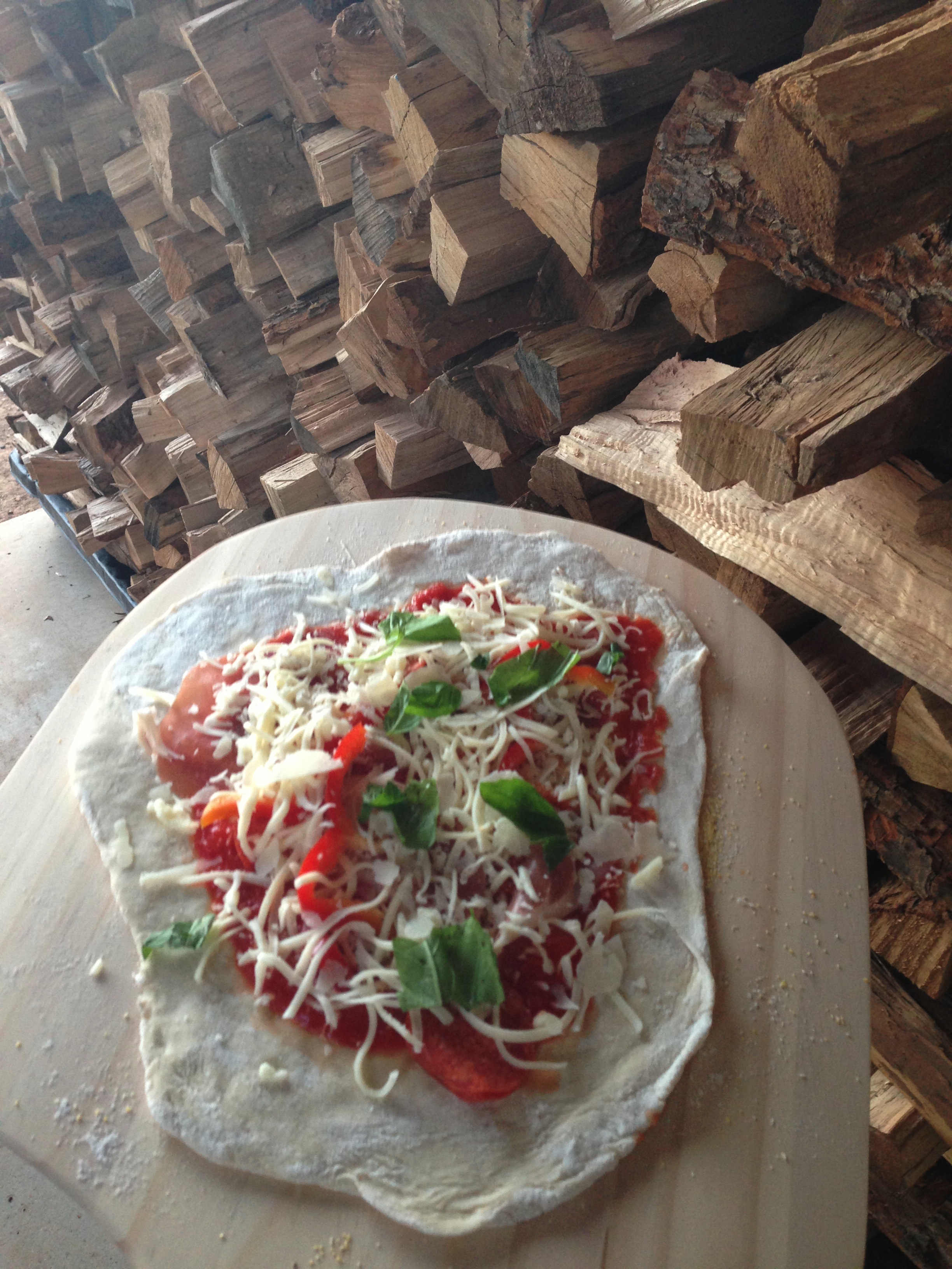 Bob got a new wood-fired pizza oven at the farm recently that I was dying to use. I love wood-fired ovens and the few times Sean and I have cooked in them the results have always been fantastic. Last Friday night we got to break it in and I came to the farm armed and ready to cook. There was a lot of planning, buying, prepping in anticipation of using it. I was texting with Payton to get advice on the dough, and I saw Bob in the kitchen at Italian Restaurant earlier in the week getting advice on the oven. I made the dough the night before and a homemade tomato sauce that day. I had three kinds of cheese, all sorts of chopped veggies, prosciutto, pepperoni, fresh basil. Marsha went and picked a number of vegetables to roast for a side that we tossed in a skillet with a little olive oil. Bob and Sean kept the fire going throughout the day to get the heat up. It was better than I had hoped.
