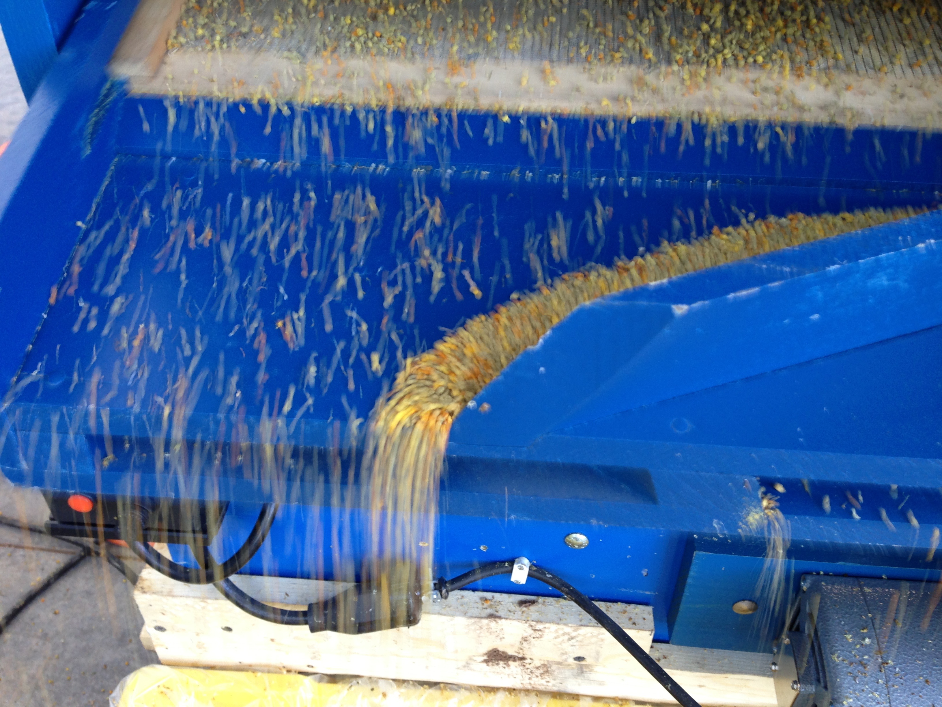 The bee pollen is shaken and sifted through several sizing screens by airflow with any waste separated and disposed.  For decades, farms have used this type of device to remove the chaff and excess plant material accompanying harvested seed so that it may be sized uniformly to fit in planters.   It also allows for inspection of the quality of seeds.  Our cleaner will be used to remove any bee material or wax while leaving the pollen granules whole.