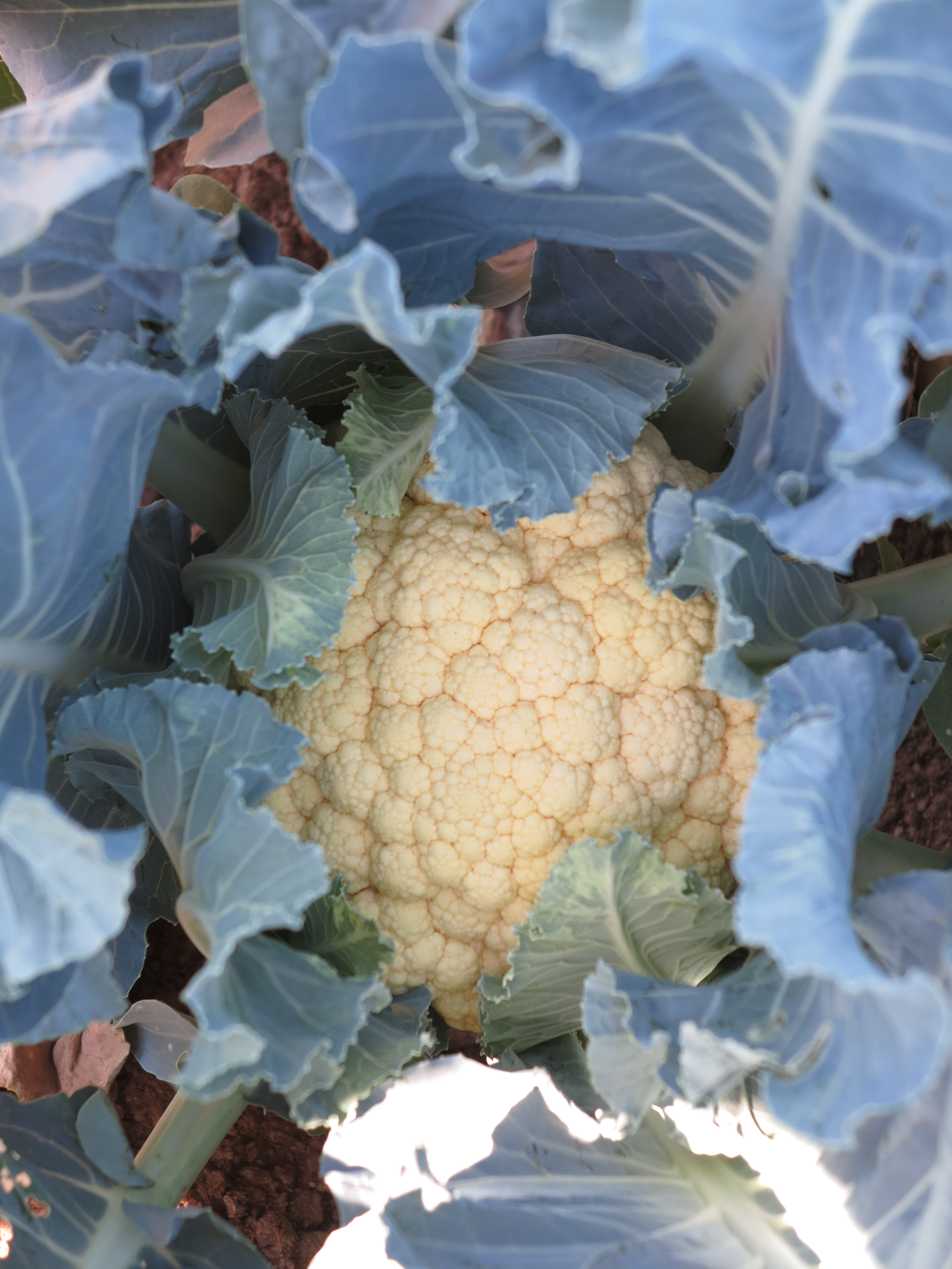 Baby cheddar cauliflower peeking out from underneath the big leaves…